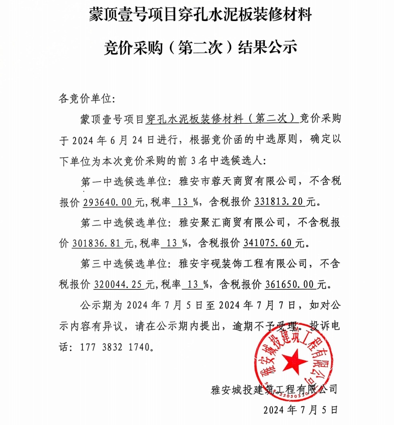 蒙頂壹號項目穿孔水泥板裝修材料競價采購(第二次)結果公示