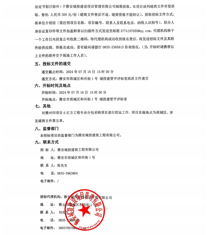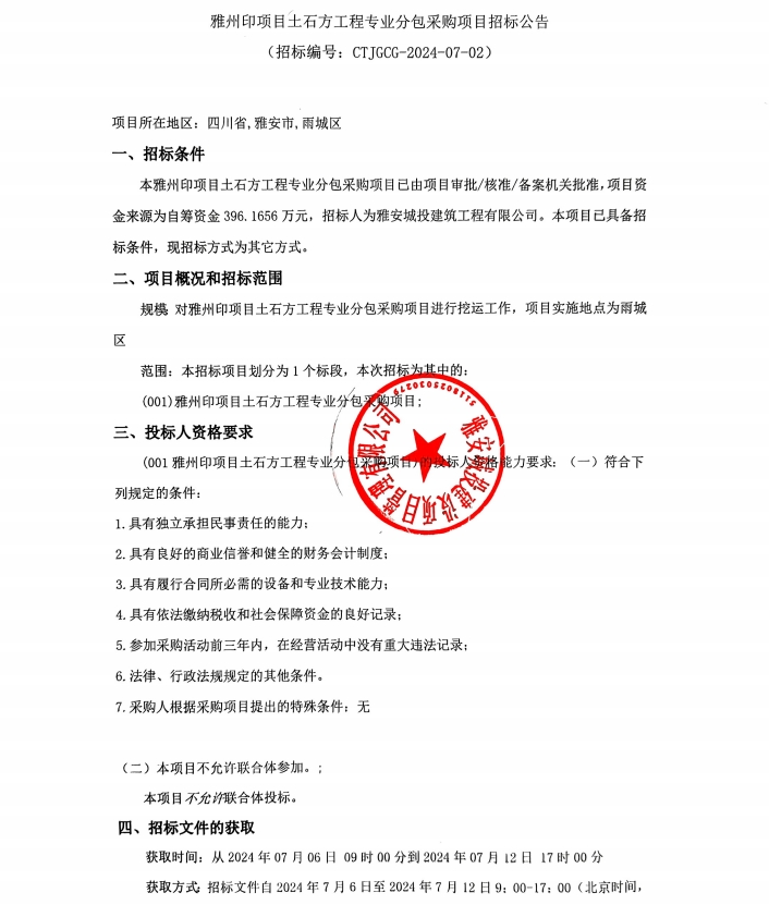 雅州印項目土石工程專業(yè)分包采購項目招標(biāo)公告