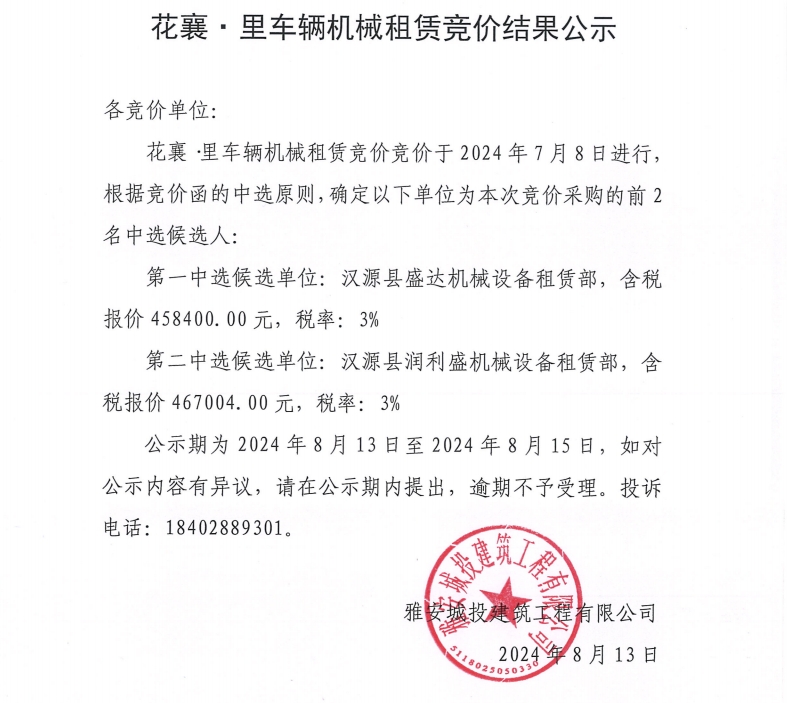 花襄·里項目車輛機(jī)械租賃競價結(jié)果公示