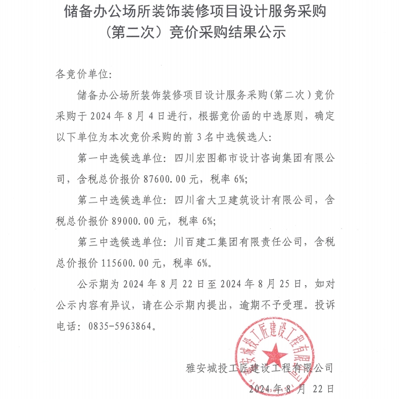 儲備辦公場所裝飾裝修項(xiàng)目設(shè)計(jì)服務(wù)采購(第二次)競價(jià)采購結(jié)果公示