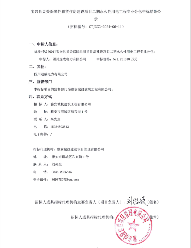 寶興縣靈關(guān)保障性租賃住房建設(shè)項目二期永久性用電工程專業(yè)分包中標(biāo)結(jié)果公示