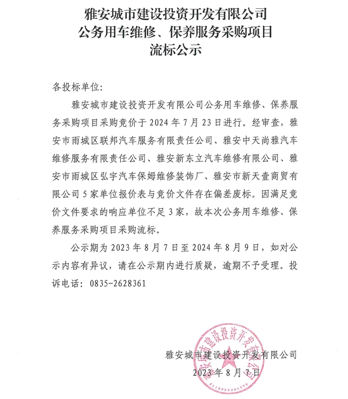 雅安城市建設投資開發(fā)有限公司公務用車維修、保養(yǎng)服務采購項目流標公示
