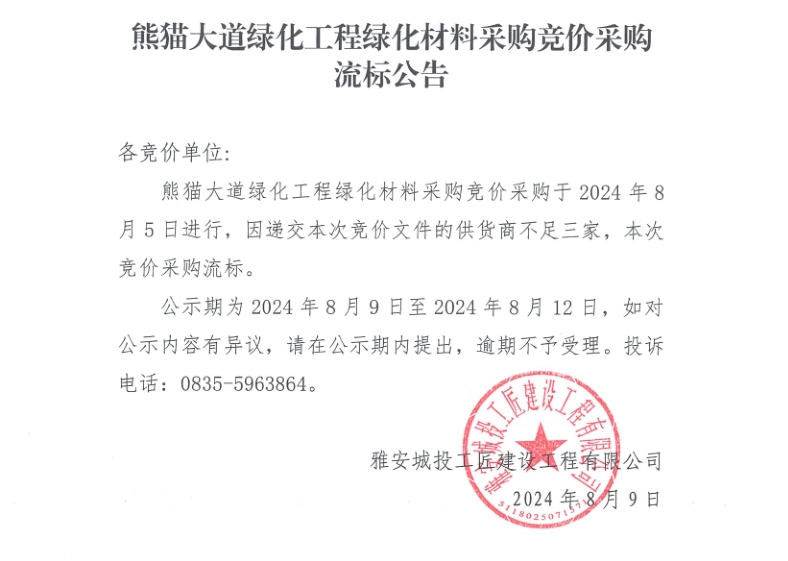 熊貓大道綠化工程綠化材料采購競價采購流標公告