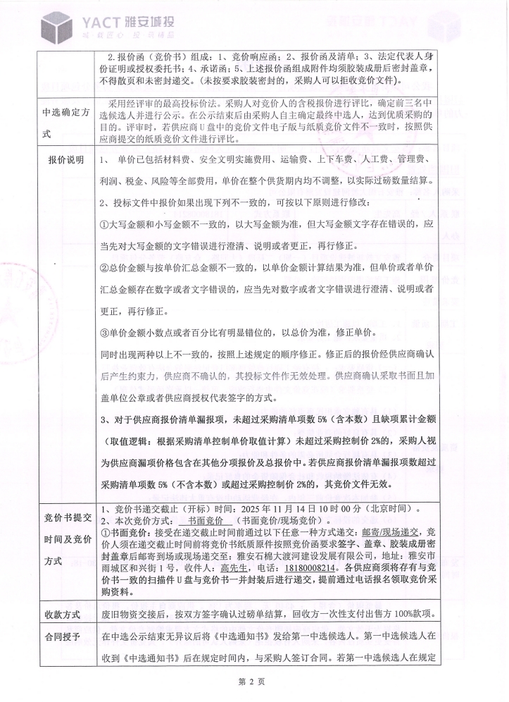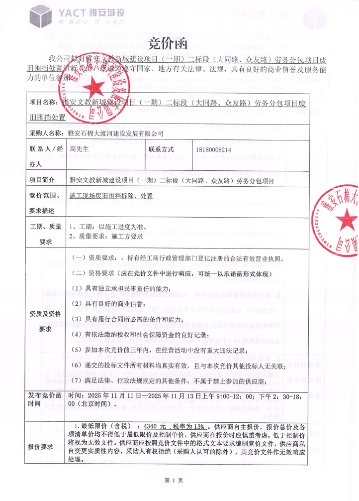 雅安文教新城建設(shè)項(xiàng)目(一期)二標(biāo)段(大同路、眾友路)勞務(wù)分包項(xiàng)目廢舊圍擋處置競(jìng)價(jià)公告