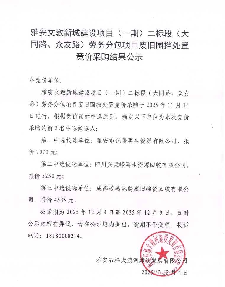 雅安文教新城建設(shè)項目(一期)二標(biāo)段(大同路、眾友路)勞務(wù)分包項目廢舊圍擋處置競價采購結(jié)果公示