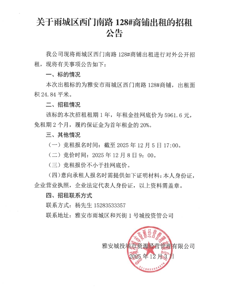 關(guān)于雨城區(qū)西門(mén)南路128#商鋪出租的招租公告