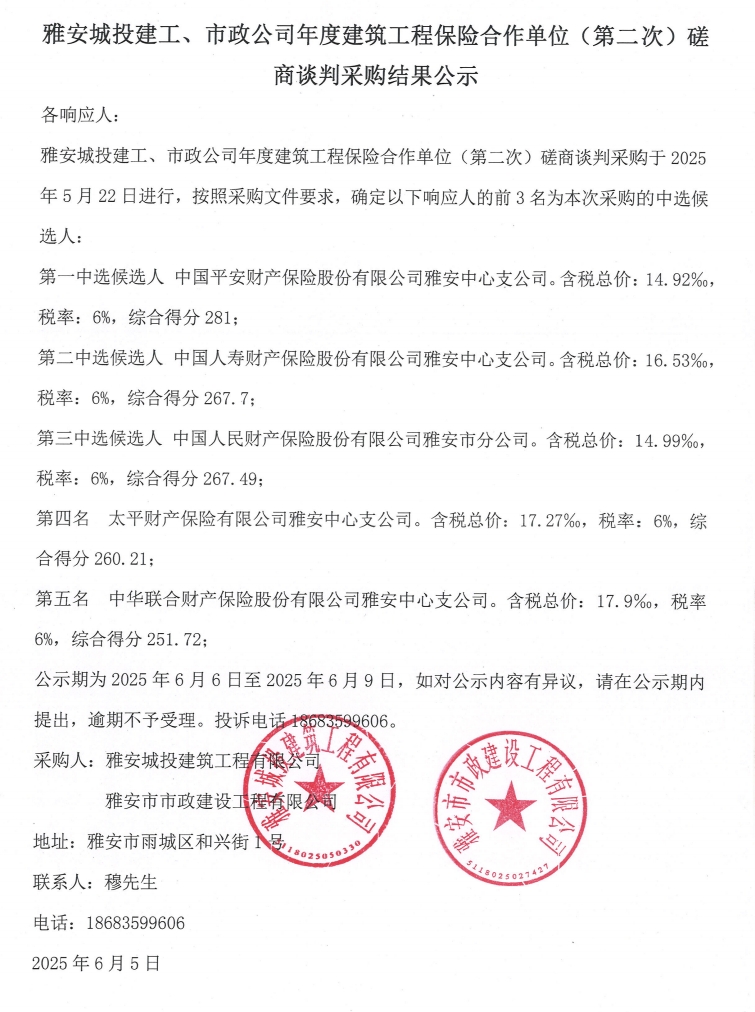 雅安城投建工、市政公司年度建筑工程保險合作單位(第二次)磋商談判采購結果公示