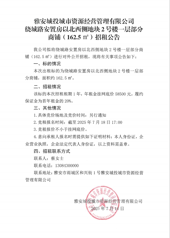 繞城路安置房以北西側(cè)地塊2號樓一層部分商鋪(162.5㎡)招租公告