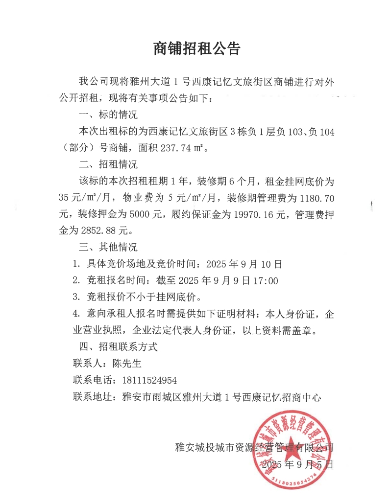 雅州大道1號西康記憶文旅街區(qū)商鋪招租公告