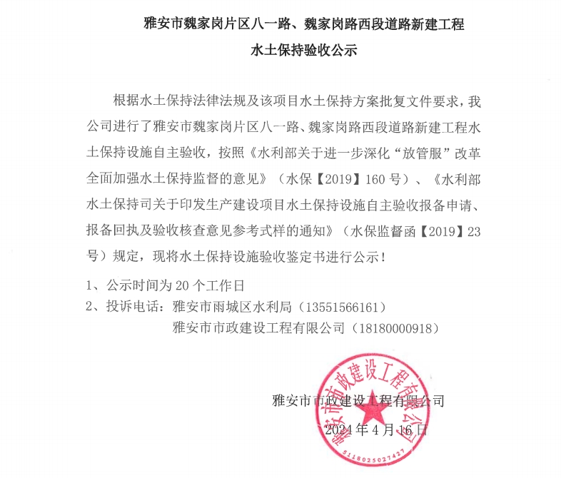 雅安市魏家崗片區(qū)八一路、魏家崗路西段道路新建工程水土保持驗收公示